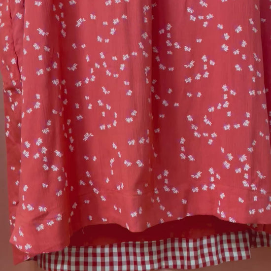 Silver Lining presents a breezy cotton crinkle shirt dress in vibrant red with soft white floral prints and contrast gingham accents on the collar, sleeves, and hem. Finished with roll-up sleeves for an easy casual vibe, it’s the perfect blend of comfort and everyday style.